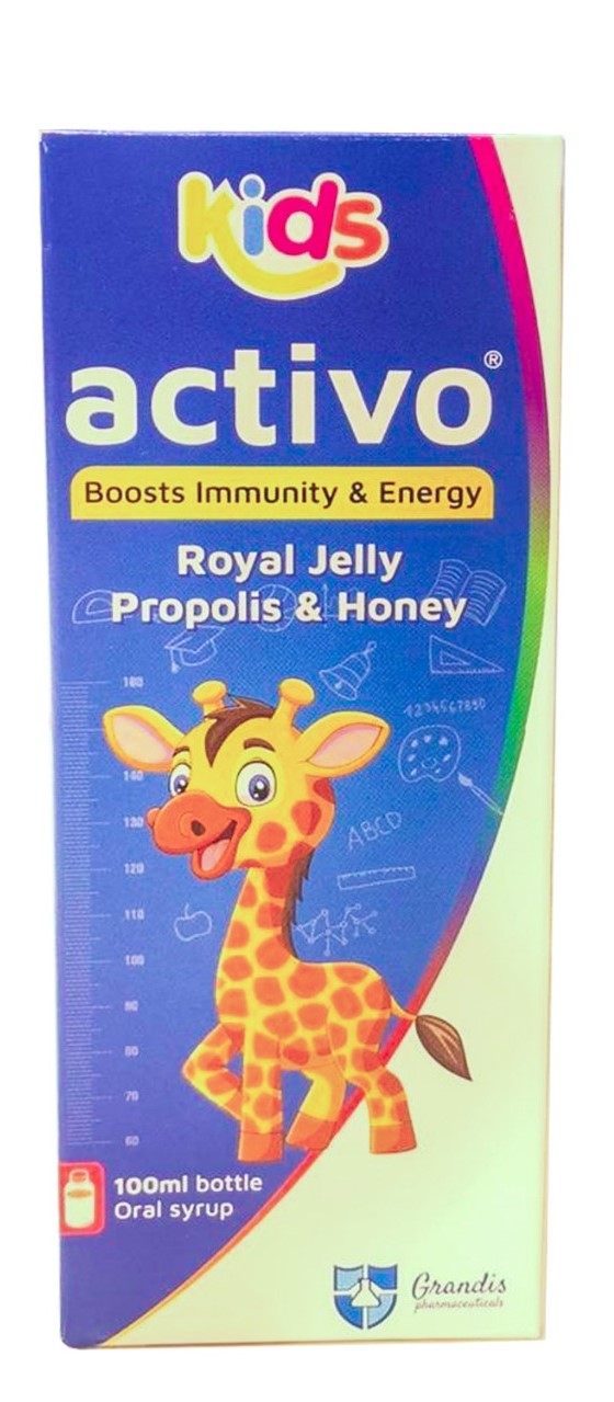 KIDS ACTIVO Oral syrup is a food supplement based on honey, royal jelly & propolis for boosts immunity & energy.