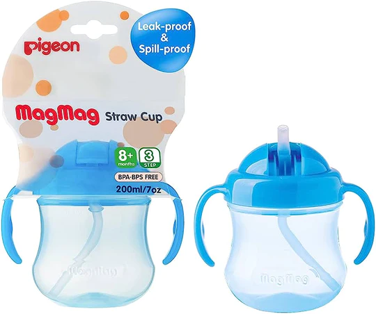 PIGEON Mag Mag straw cup for 8+months babies & it has soft silicone straw for easy drinking & has unique angled straw to drink till the last drop.