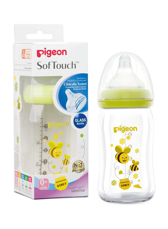 PIGEON Soft touch glass bottle is clinically tested for seamless switch between breast & bottle, it has anti-colic system for 0+month babies.